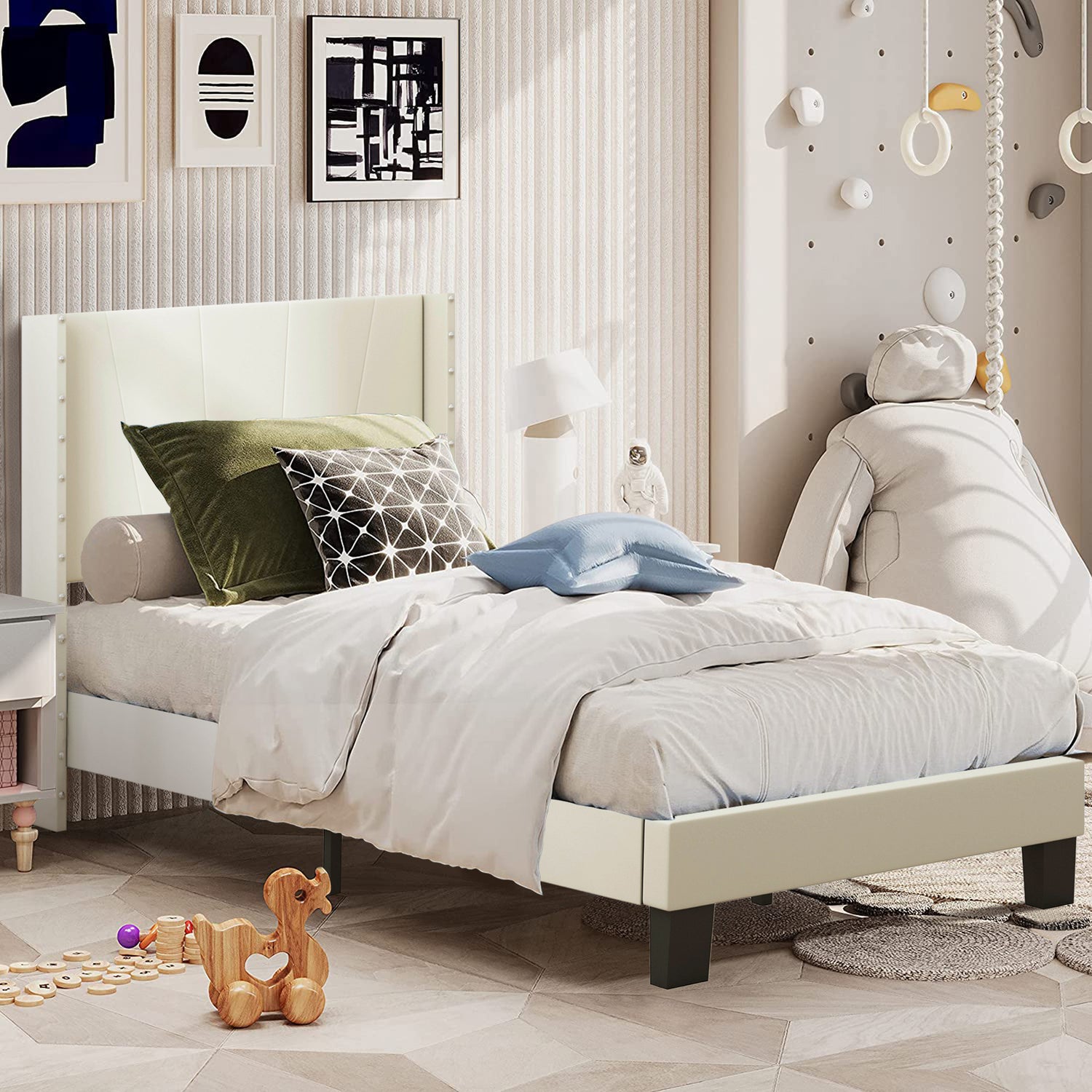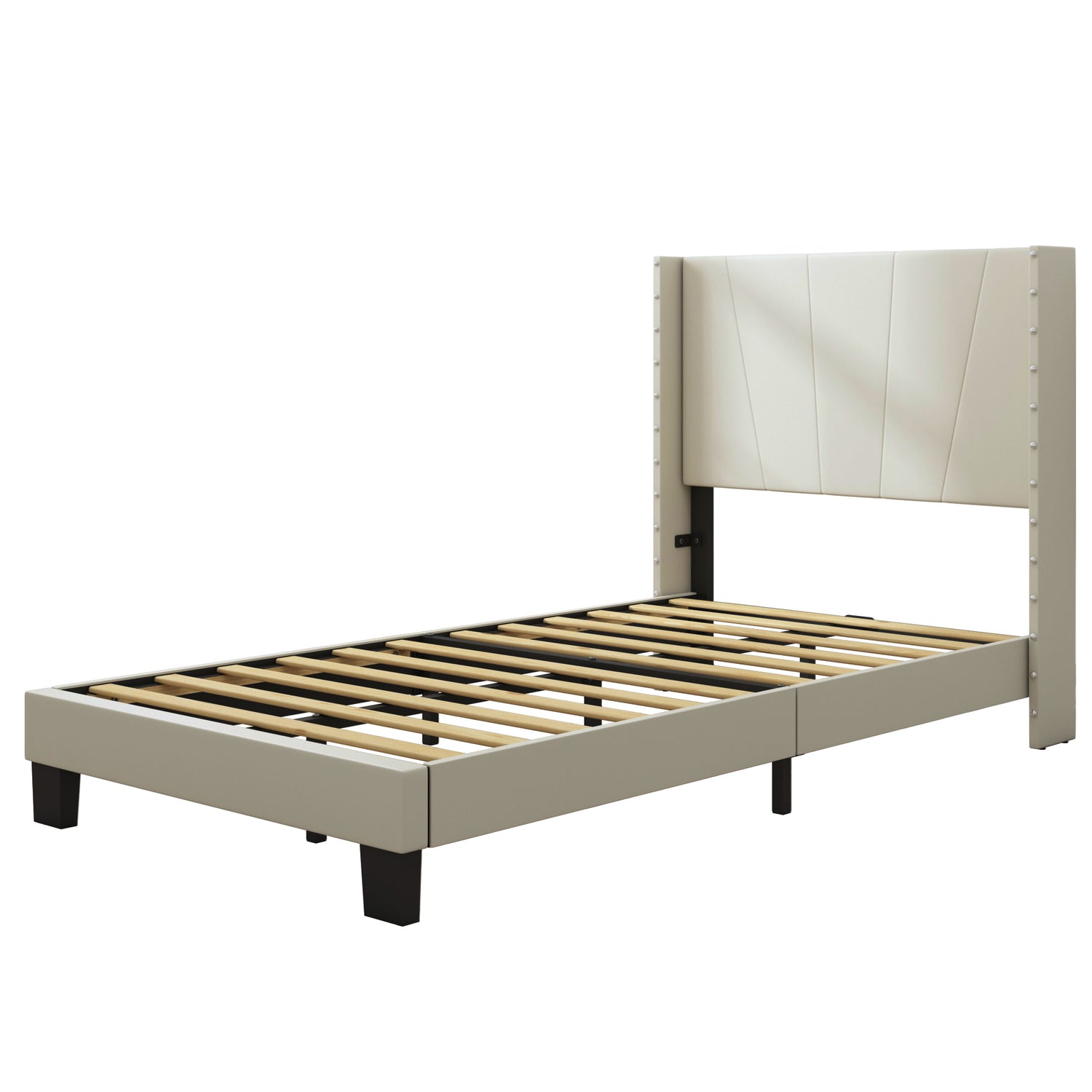 SYNGAR Twin Size Fabric Fully Upholstered Platform Bed Frame with Rivet Wingback Headboard, Sturdy Metal Frame, Strong Wooden Slats, No Box Spring Needed, Easy Assembly, Beige
