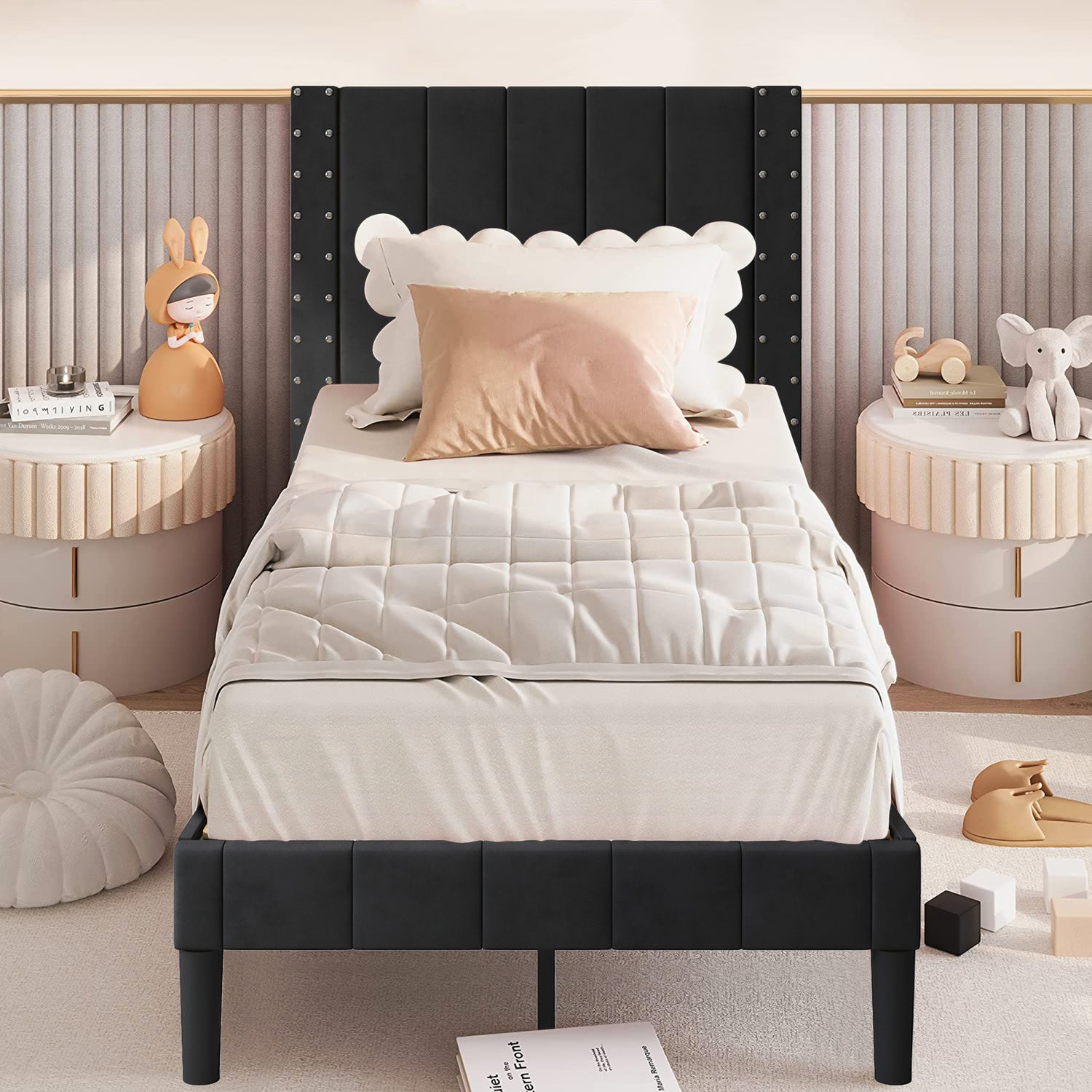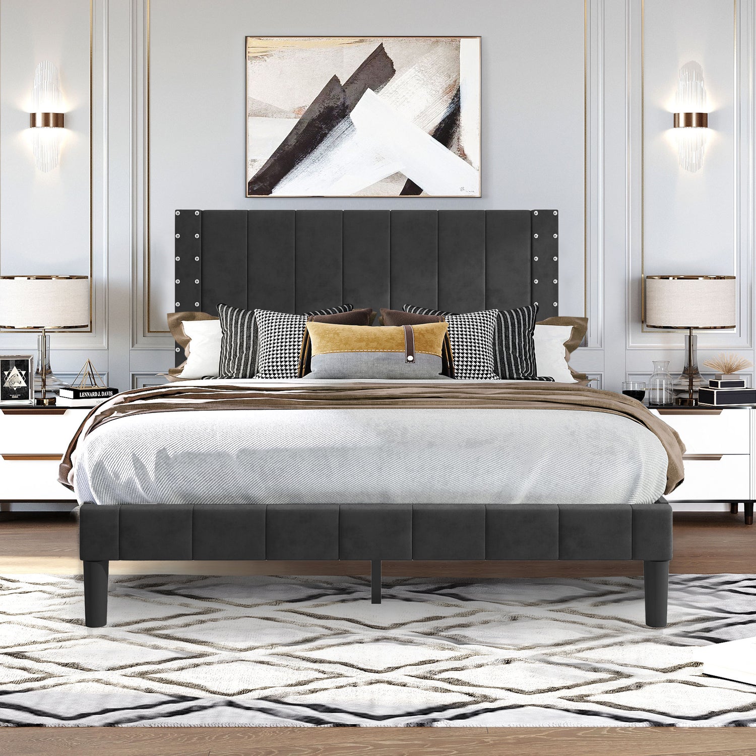 SYNGAR Upholstered Platform Bed with a metal frame and solid wood slats support combined to provide a solid foundation for a good night's sleep. With an elegant upholstered rivet wingback design headboard for sturdy construction and durability. Includes a comfortable headboard, sturdy metal frame, strong wood slats, and support legs of the bed to support your memory foam, latex, or spring mattress (not included). Made of quality fabric upholstered, metal frame, and wood slats, this platform bed is durable and sturdy and can serve your family for years.