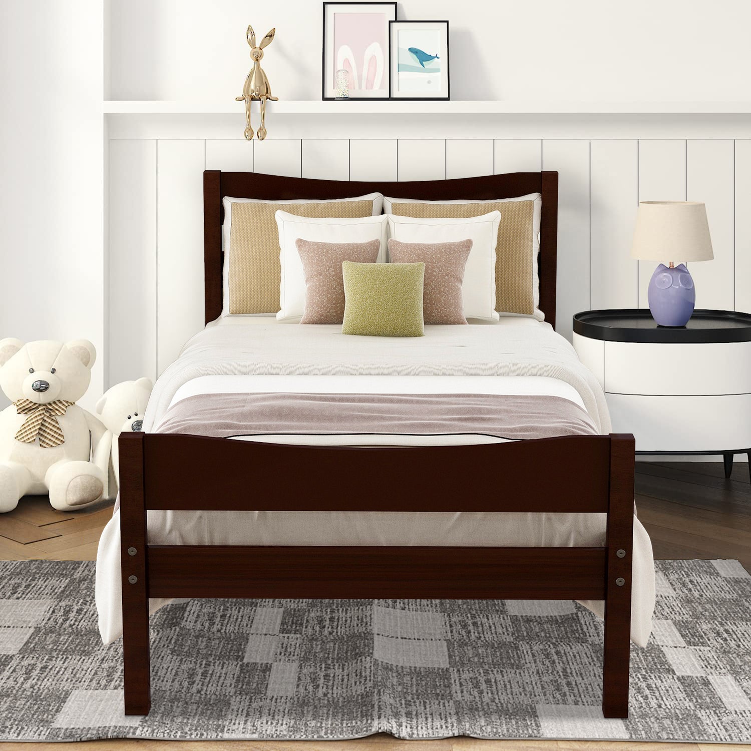 Sturdy Bed Frame - The strong pine wood frame includes a headboard, footboard, and solid wood slats to ensure security.