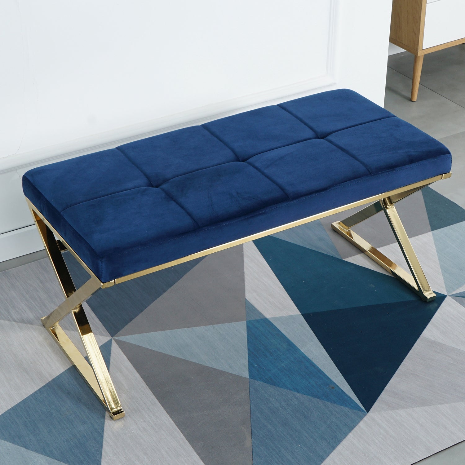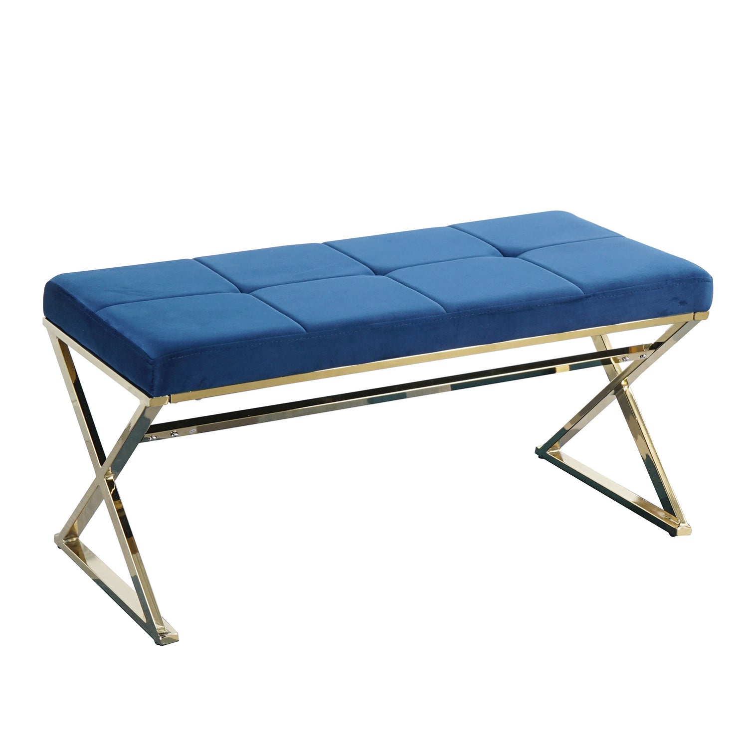Made of Solid quality, breathable, and skin-friendly Velvet cushion and foam padded, this bench is soft and comfortable. The whole frame and x-legs of this upholstered bench with sturdy golden chrome legs and the finely crafted metal frame are durable elegant, and luxurious.