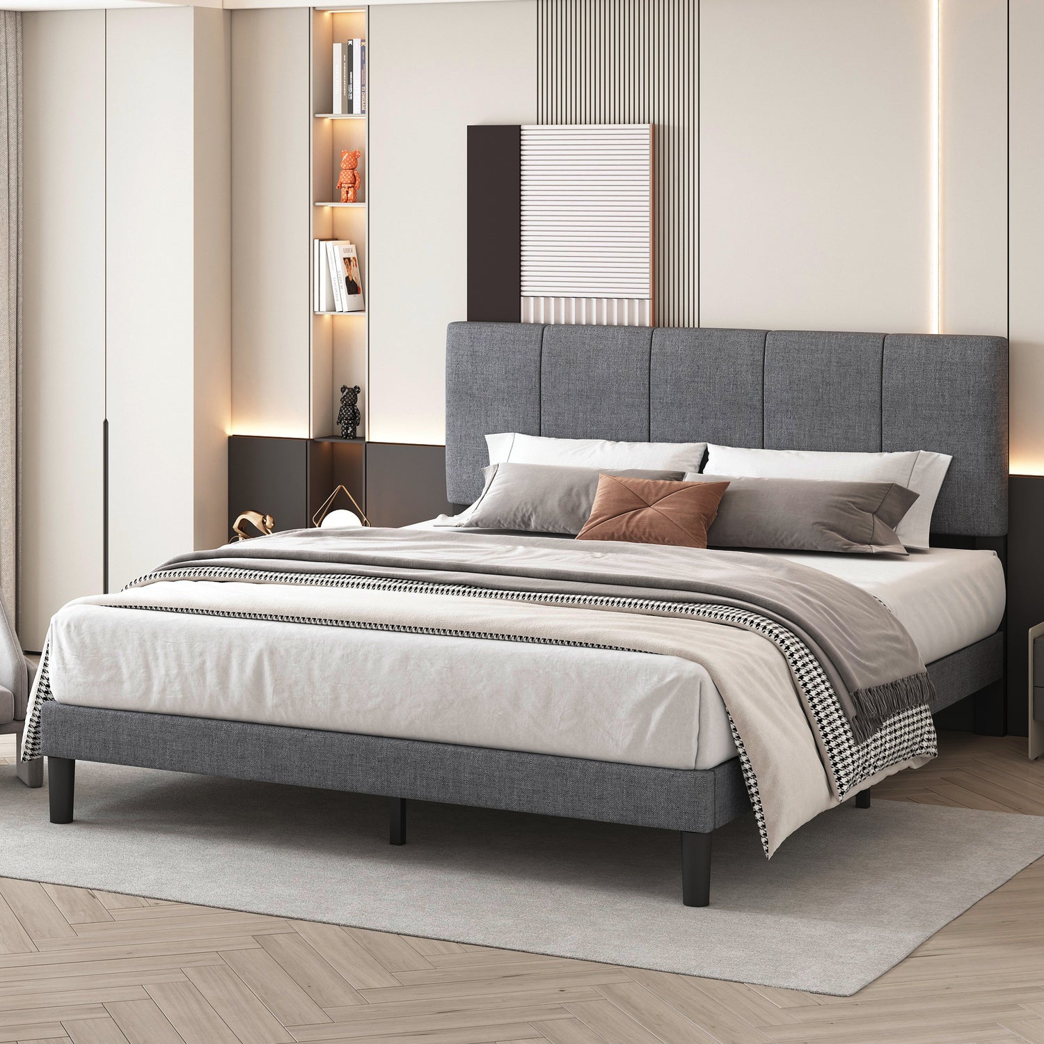 Sleek Design and Neutral Tones - This Upholstered Platform Bed Frame offers a sleek, modern design, seamlessly blending into any bedroom decor with its neutral tones and contemporary aesthetic.