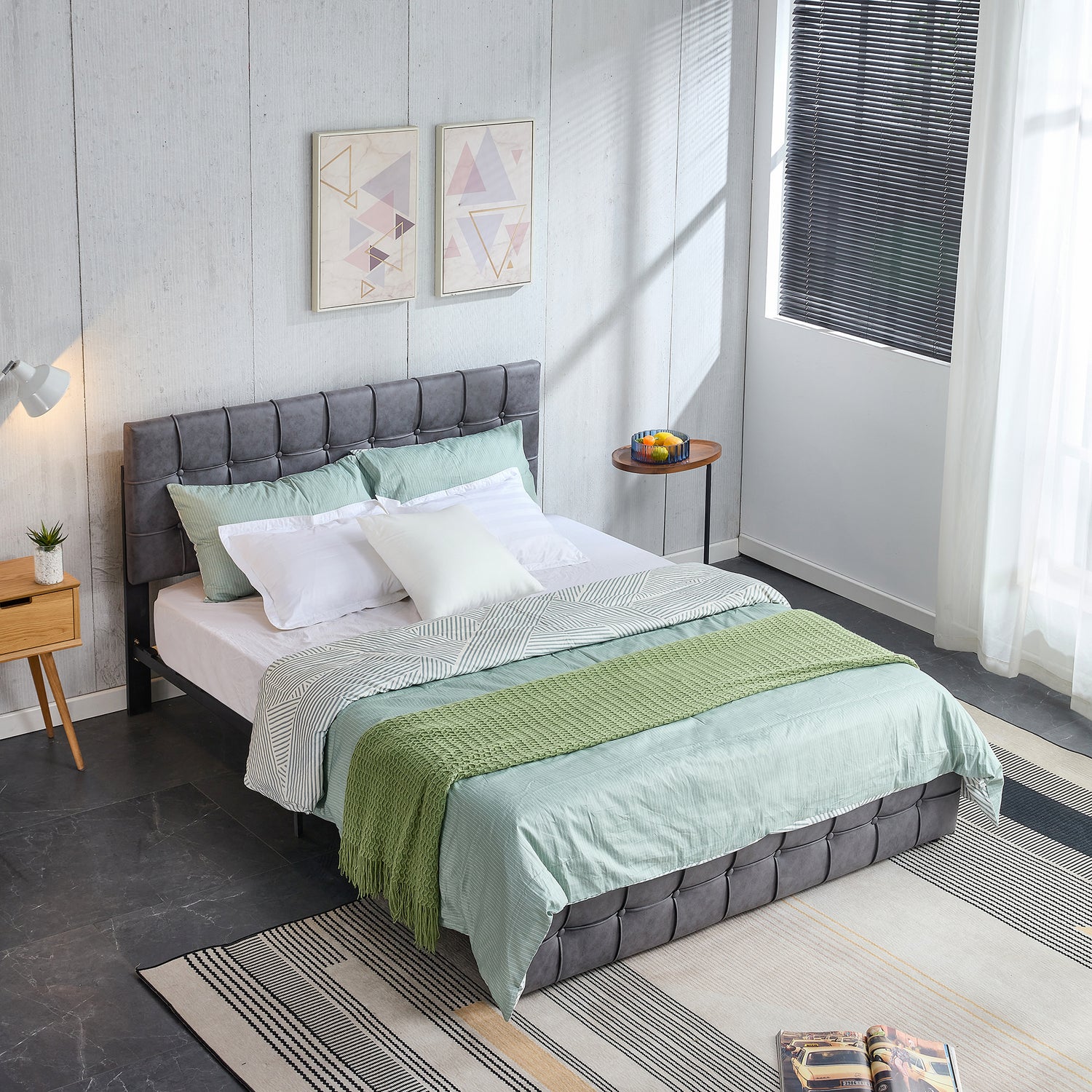 Our upholstered platform bed frame with solid wood support provides a solid foundation for a good night's sleep. Including a comfortable and beautiful button tufted headboard and footboard, strong wood slats, metal frame, wood legs, and center support legs of the bed to support your memory Sponge, latex, or spring mattress (not included). With its elegant style and Sponge-filled polyester upholstered headboard and footboard, this bed frame is a can’t-miss centerpiece for any bedroom that doesn’t sacrifice stability or comfort. And the height of the headboard can be adjusted in three heights: 39.37 inches, 43.31 inches, and 47.24 inches, you can adjust it according to your needs to fit your mattress.