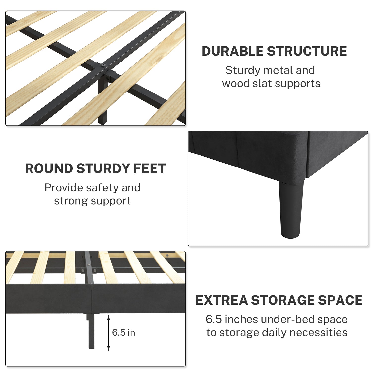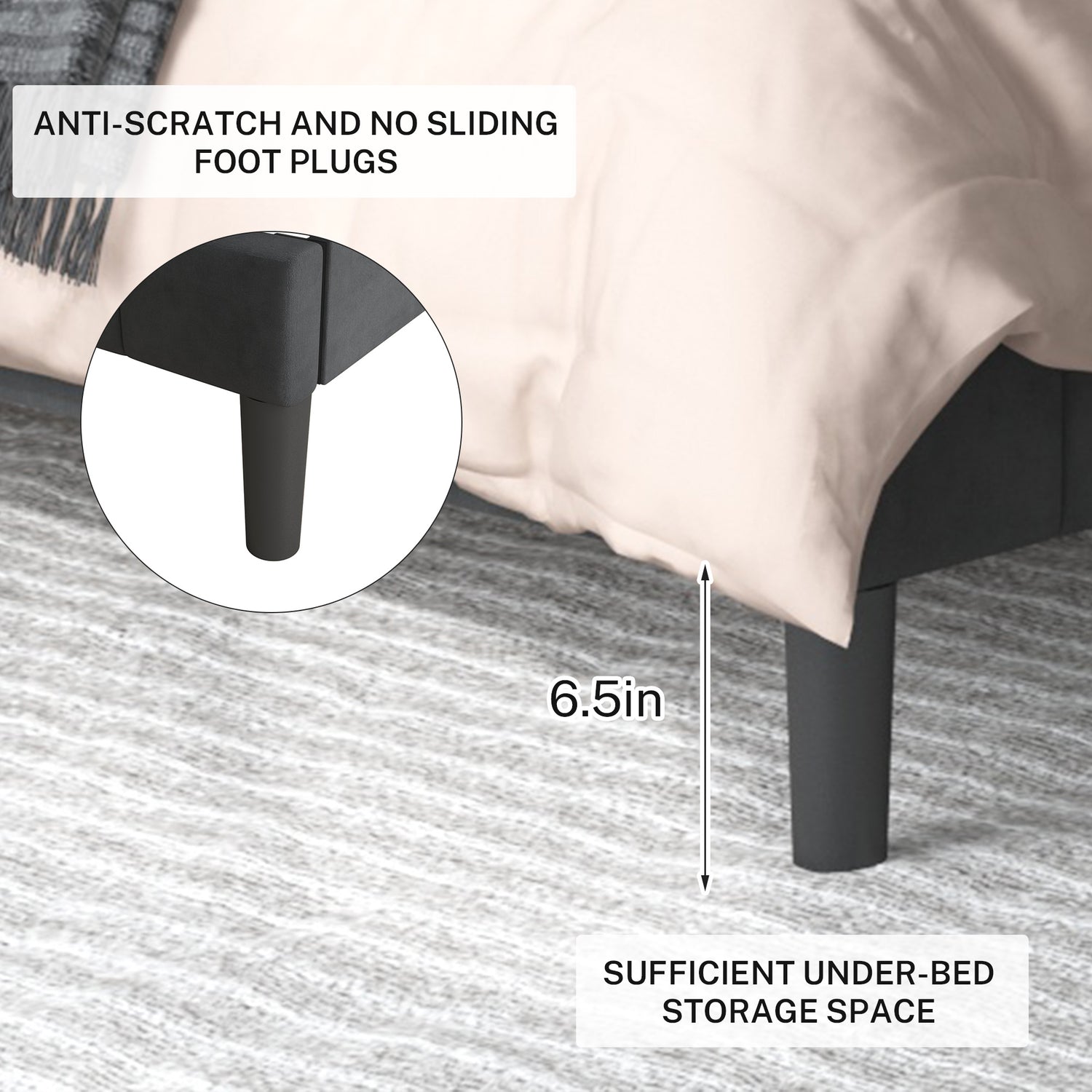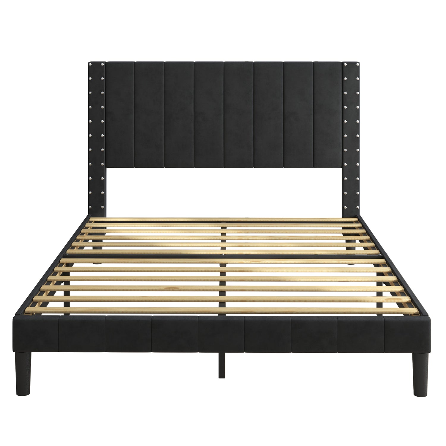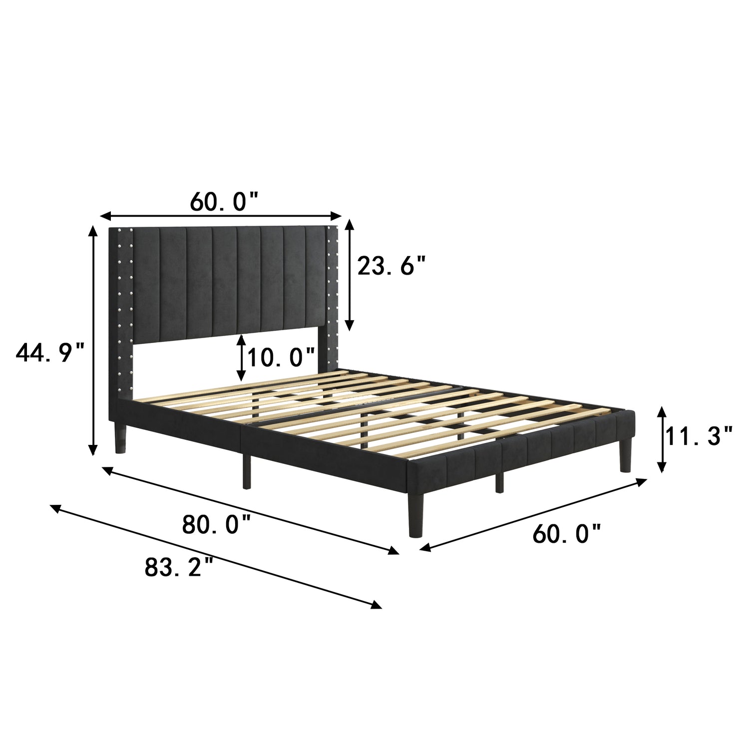 SYNGAR Upholstered Platform Bed with a metal frame and solid wood slats support combined to provide a solid foundation for a good night's sleep. With an elegant upholstered vertical channel design with rivets decor headboard for sturdy construction and durability. Includes a comfortable headboard, sturdy metal frame, strong wood slats, and support legs of the bed to support your memory foam, latex, or spring mattress (not included). Made of quality fabric upholstered, metal frame, and wood slats, this platform bed is durable and sturdy and can serve your family for years.