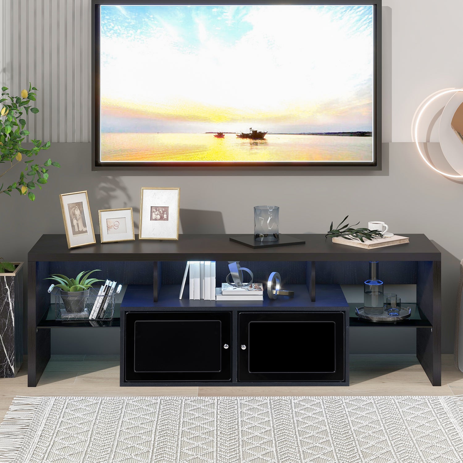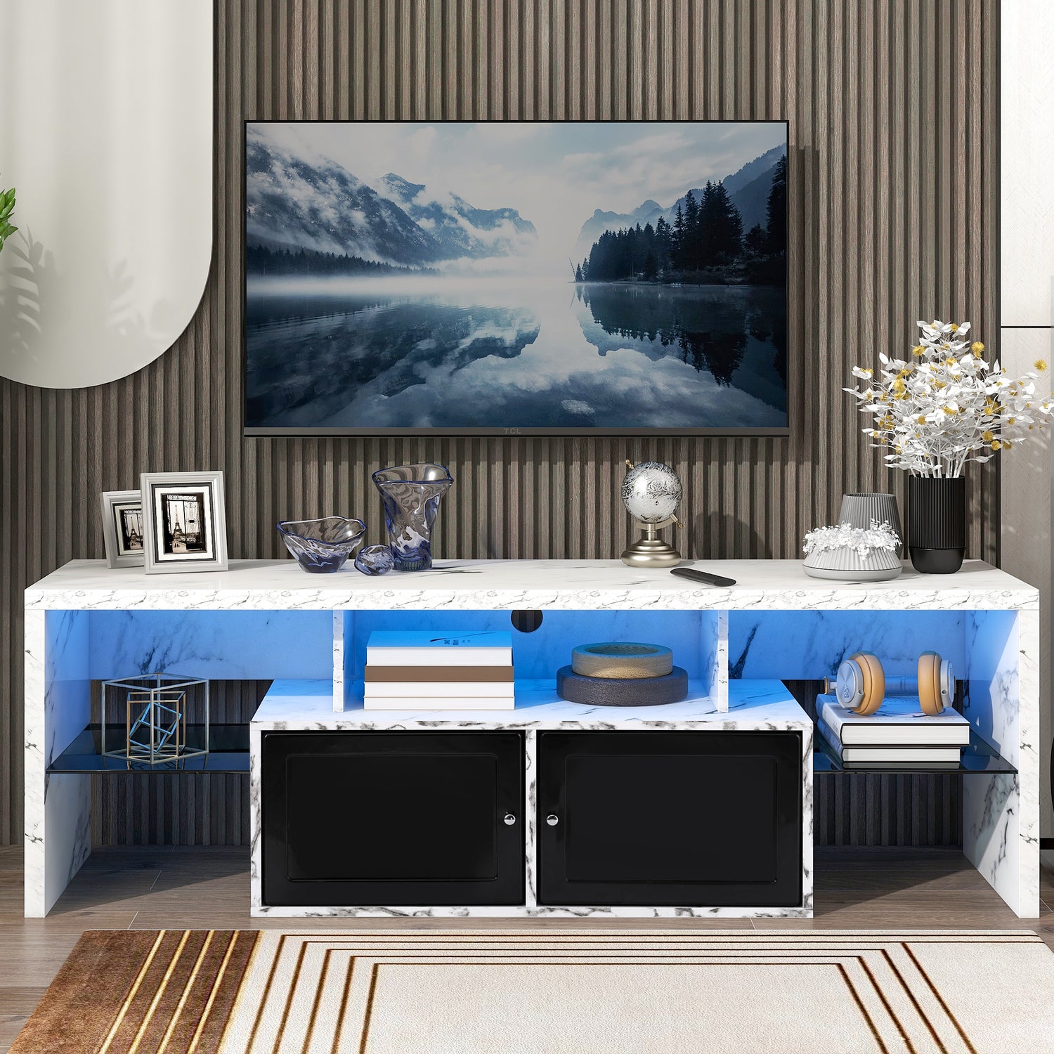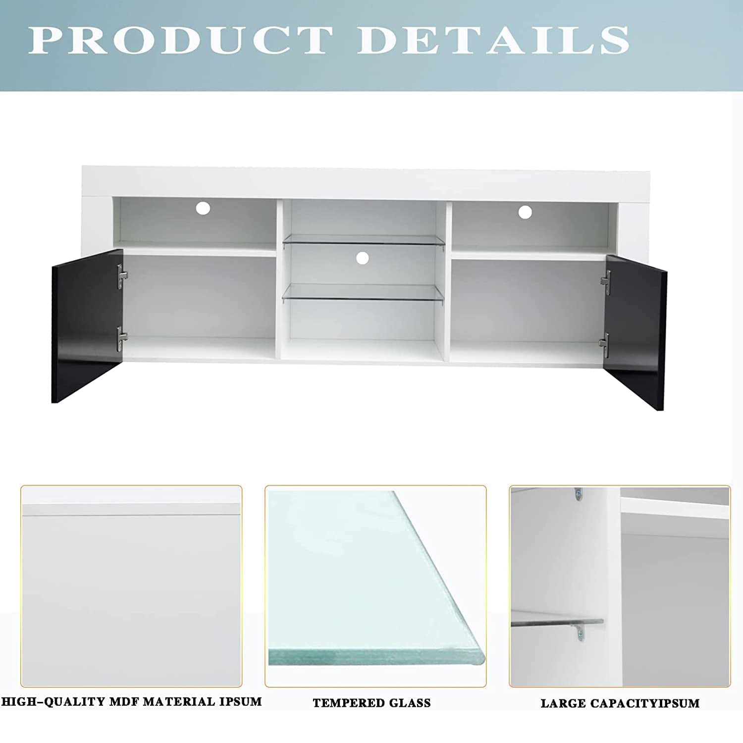 The TV cabinet is made of Solid quality particleboard, the surface is smooth and easy to clean, and it brings a fashionable feeling. The 16-color remote-controlled LED lights with modern characteristics will bring a warm feeling to your home.