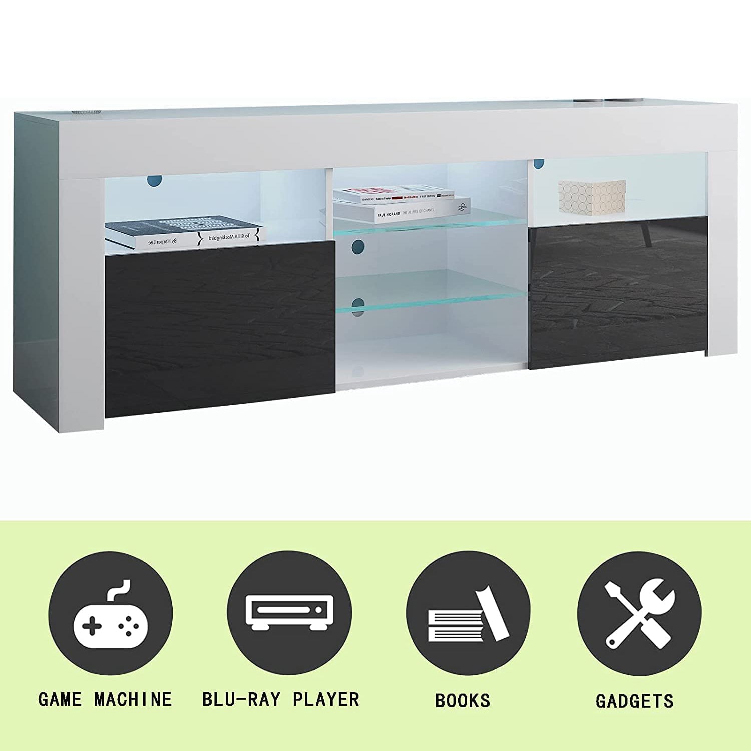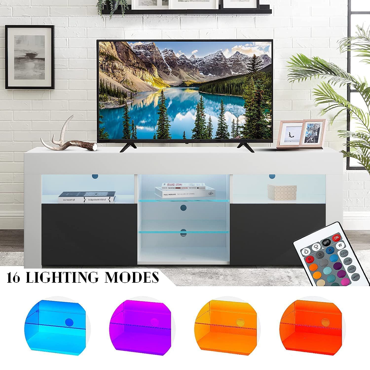 Remote Control LED Lights - The 16 colors of LED lights of this TV cabinet can be changed and adjusted remotely, which is convenient.