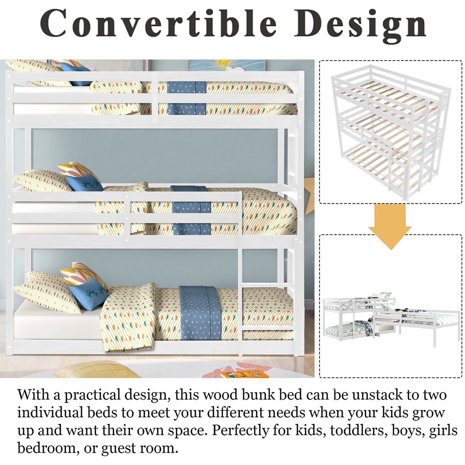 The use of vertical space saves you a lot of space and also can be easily converted into 3 separate beds. A triple bunk bed can meet your different needs, which is perfect for families with multiple members or guests who spend the night.
