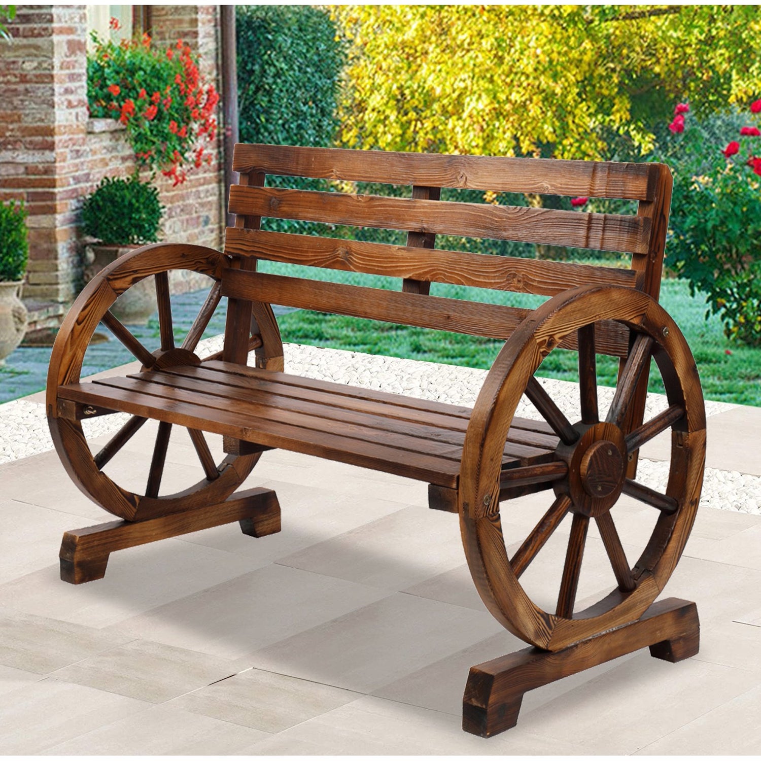 SYNGAR's new solid wood outdoor bench features a unique wheeled design that will add a touch of color to your garden and patio areas. Made from solid fir wood, this bench can accommodate two people at a time and can hold up to 560lbs. The wide backrest allows you to relax in comfort. The wheel-shaped armchair is both aesthetically pleasing and functional. Perfect for gardens, backyards, porches, this bench is a must-have!