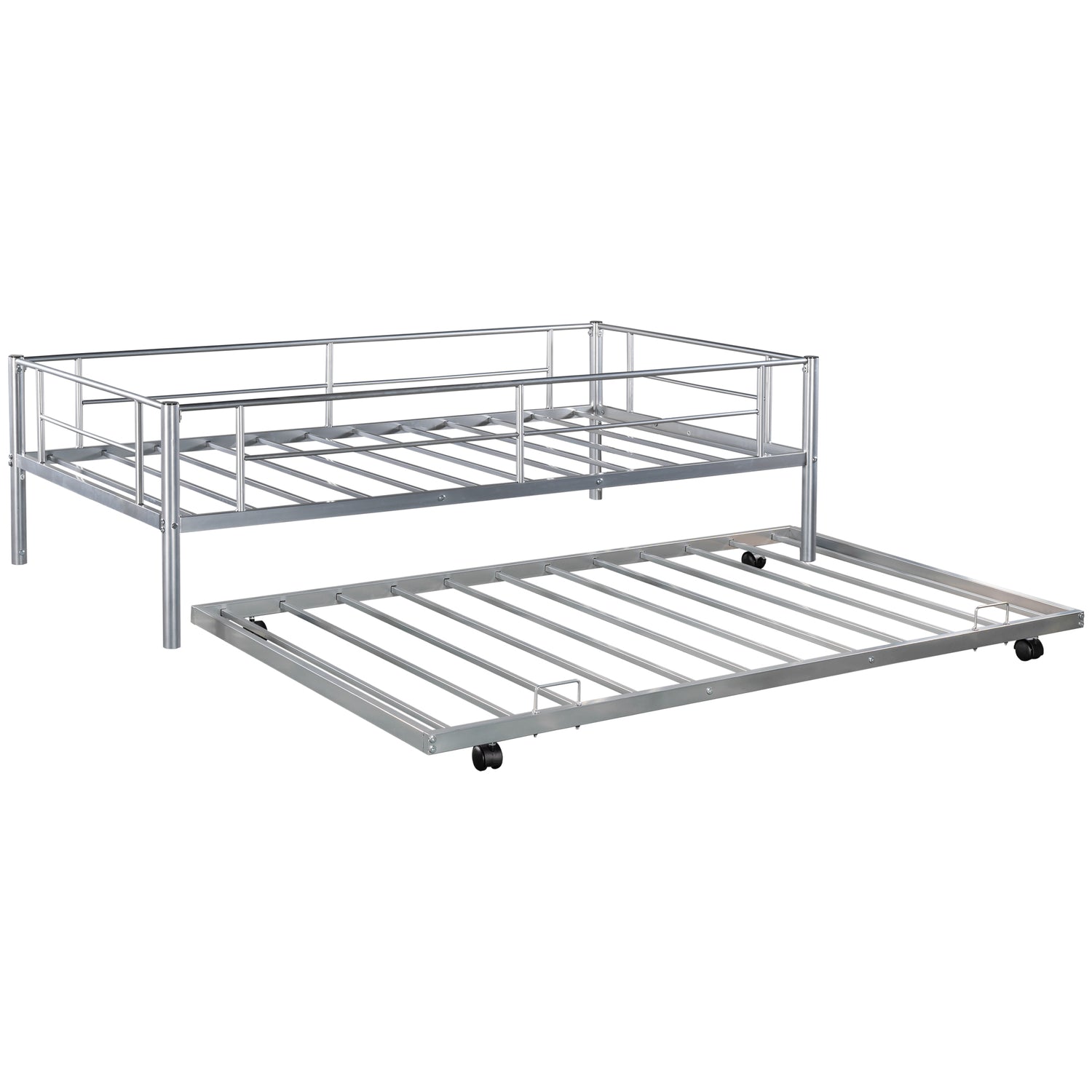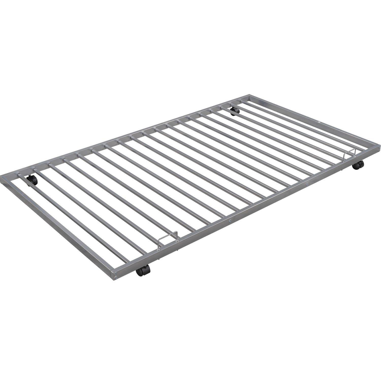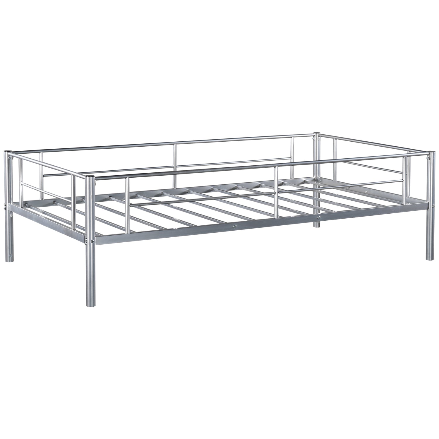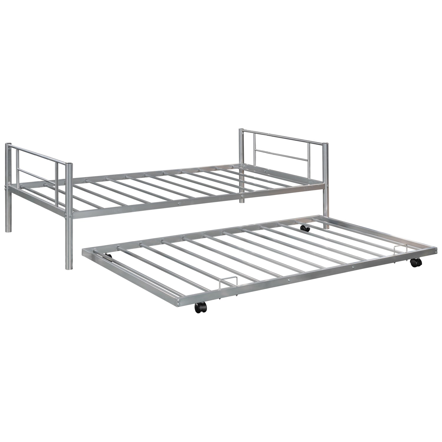 The twin bunk bed frame is constructed with heavy duty powder-coated metal that is rust-resistant and durable enough for long time use. And the upper can withstand max 250 lbs while the bottom bed can withstand max 350 lbs. The 21 metal slats support the mattresses not to slide and also increase the mattresses life(the mattresses are not included).