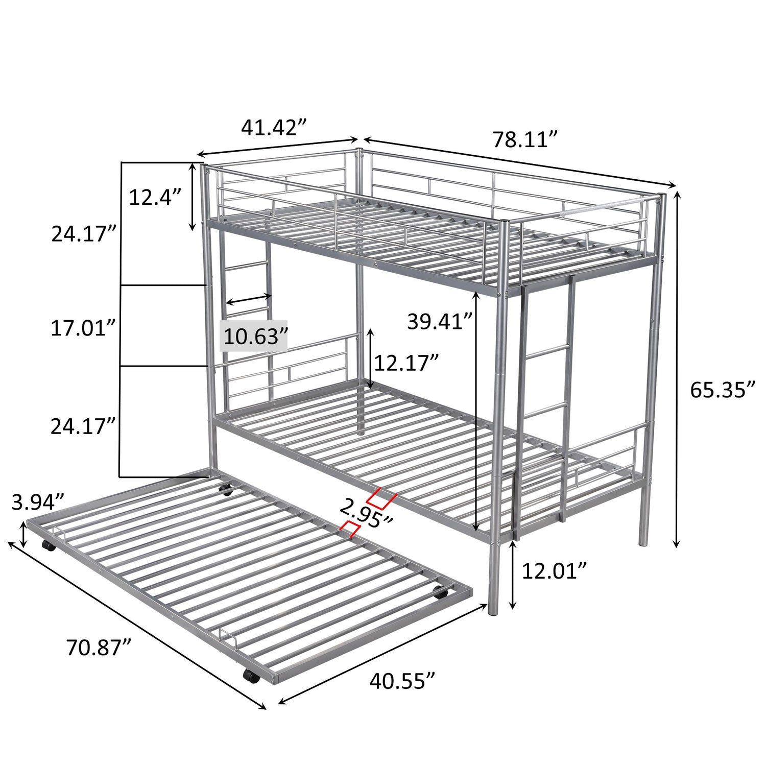 Overall size: 78.11"L x 41.42"W x 65.35"H. Weight Capacity: 250 lbs for upper bed, 350 lbs for lower bed, and 250 lbs for the trundle bed. It comes with a clear install guide and all necessary tools are provided to get this bed frame assembled in no time. Equipped with mattress slats, you could put a standard mattress directly. Mattress not included.