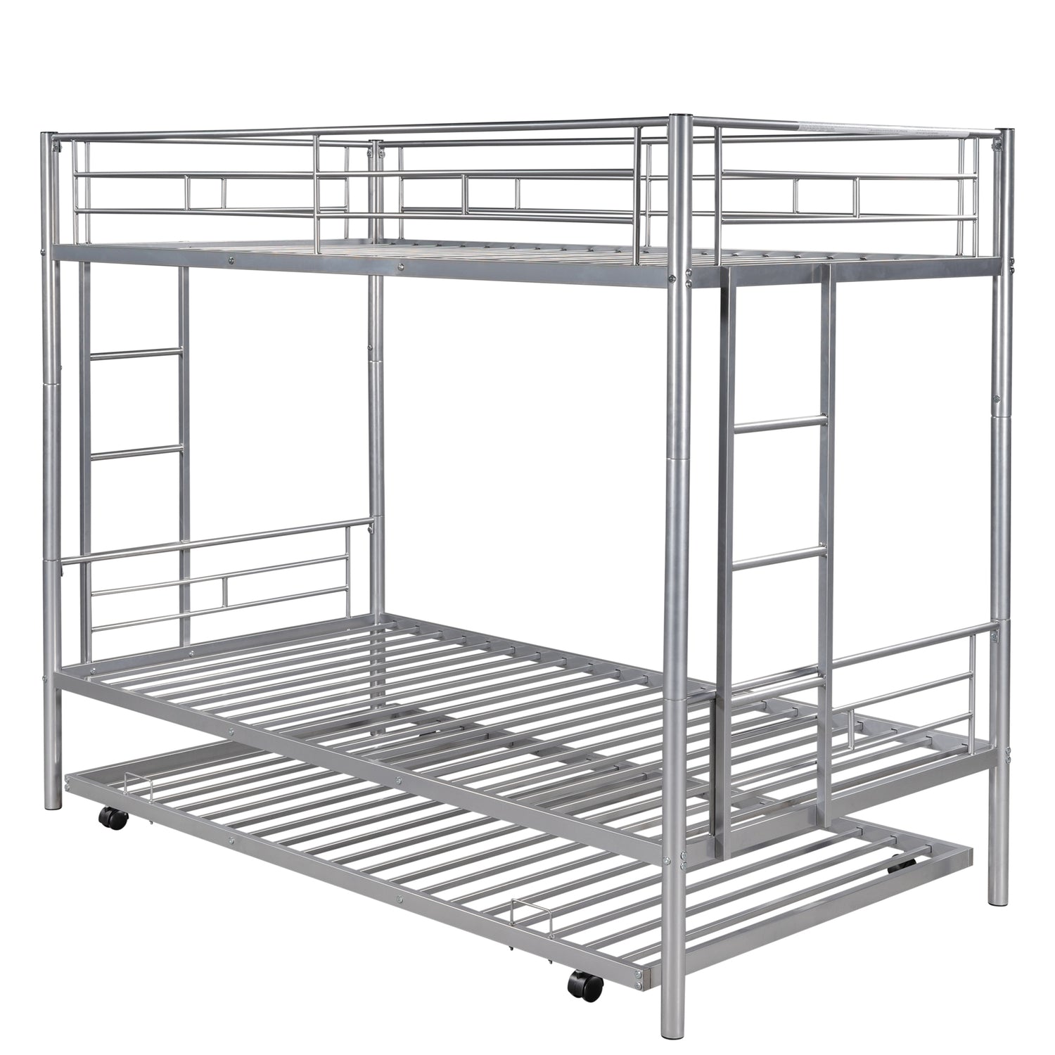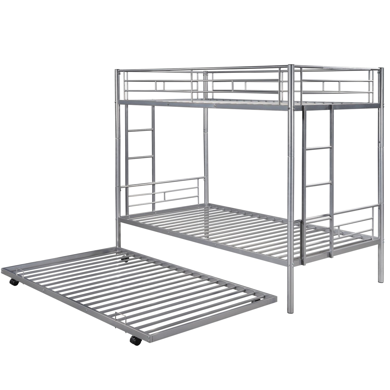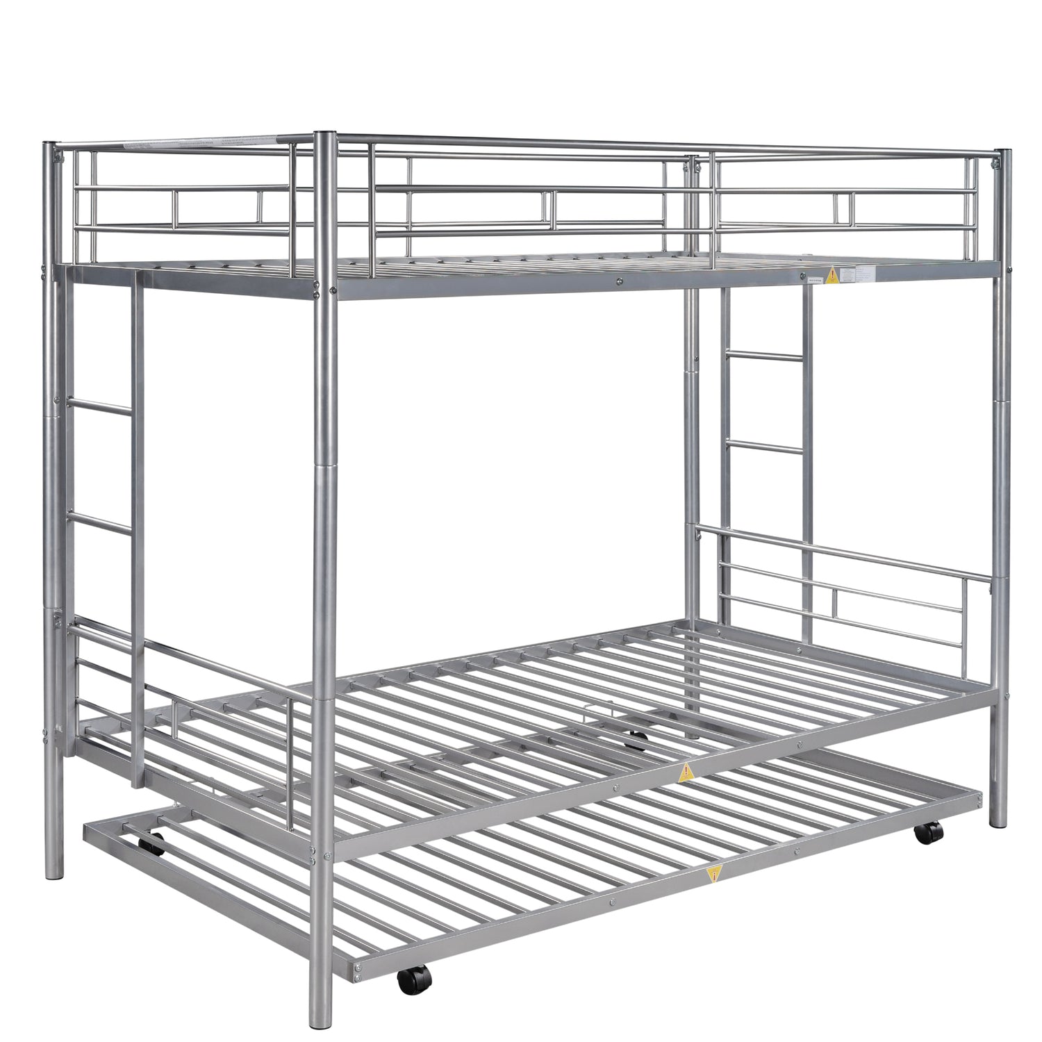 Twin over Twin Bunk Bed Frame with Trundle, SYNGAR Upgraded Bunk Beds with Ladder & Guardrail, Heavy Duty Kids Bedroom Furniture Bunk Bed for Boys and Girls, Space Saver Guest Room Bunk, Silver, C24