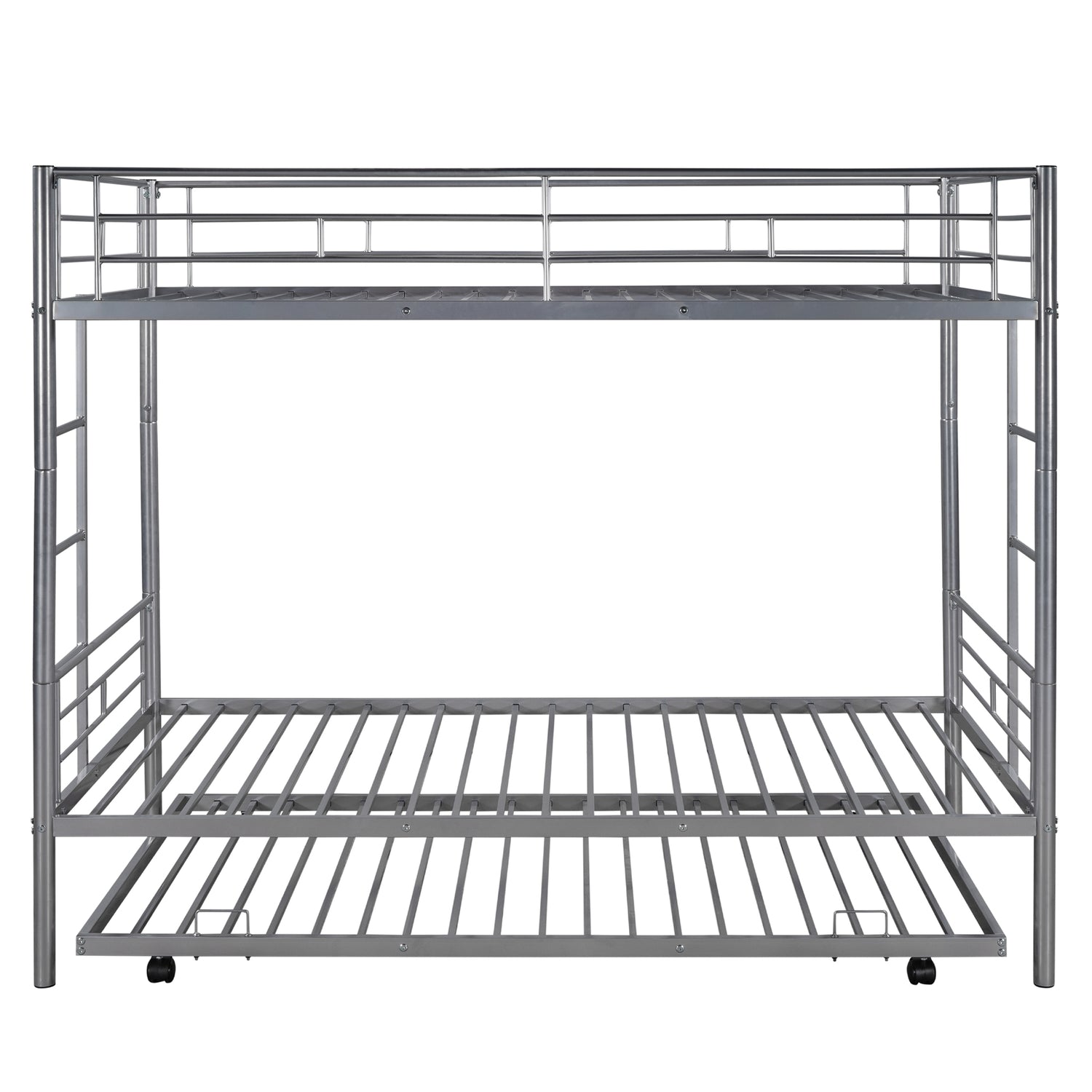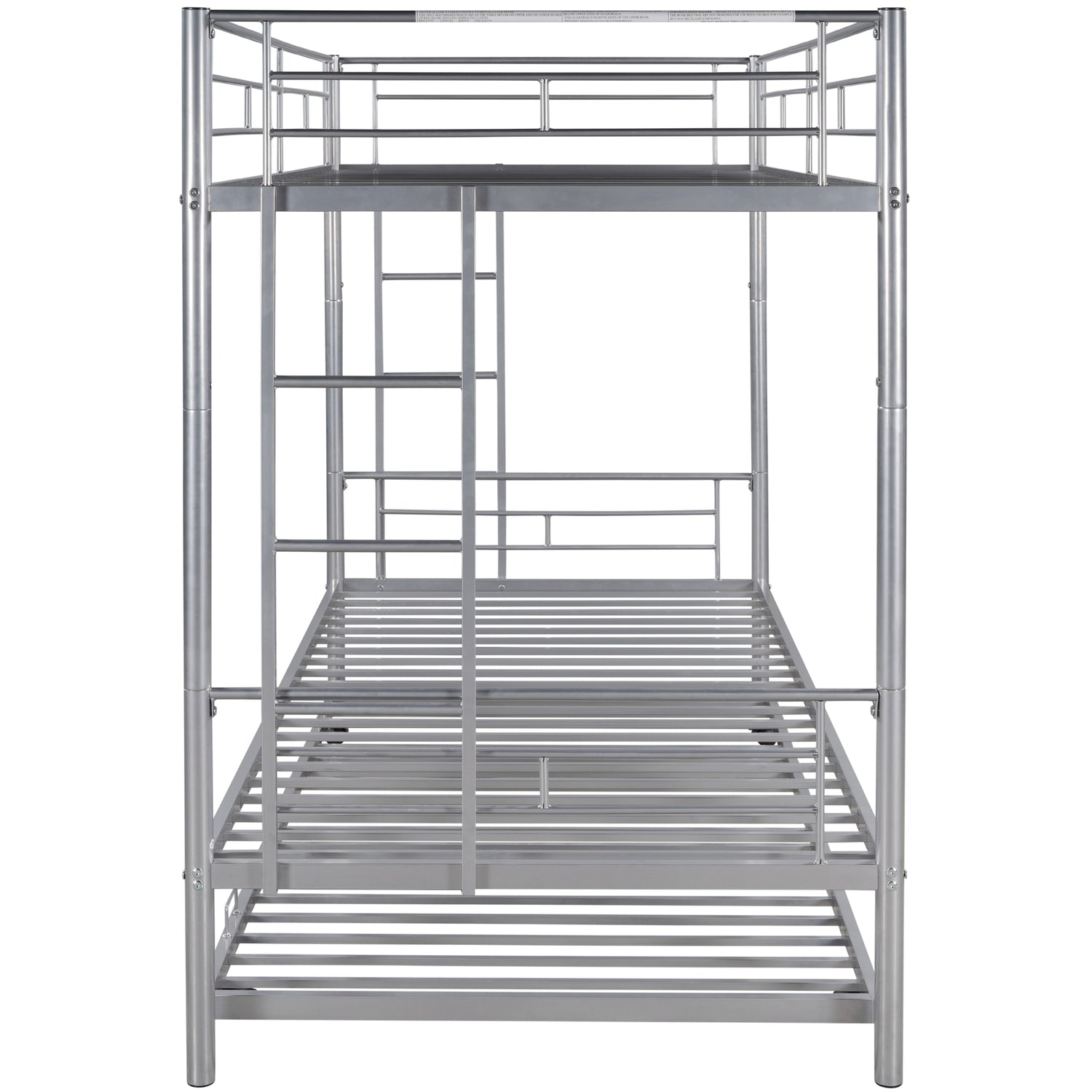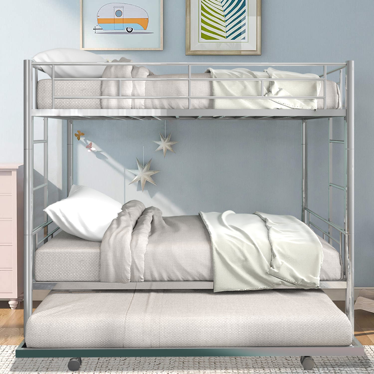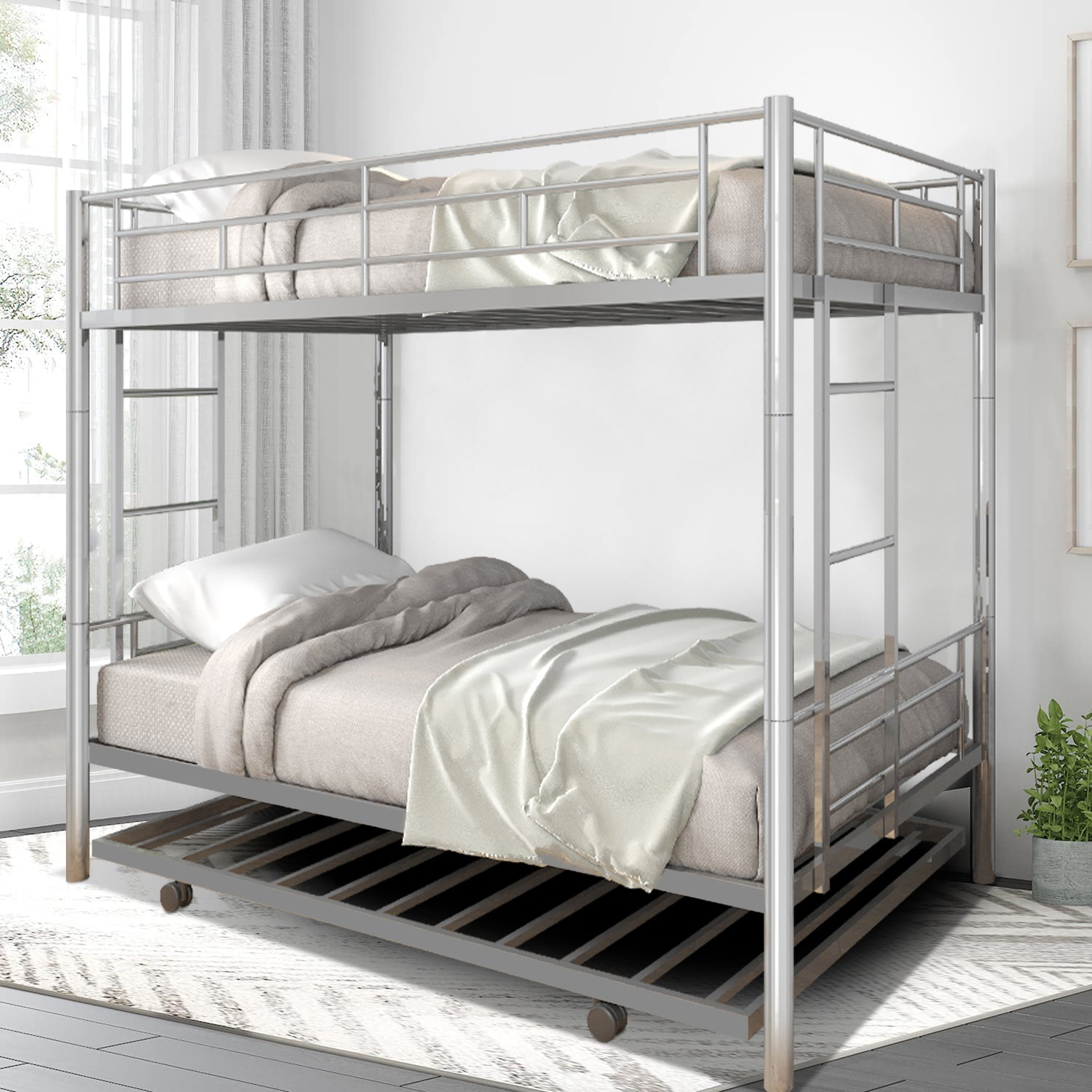 Twin over Twin Bunk Bed Frame with Trundle, SYNGAR Upgraded Bunk Beds with Ladder & Guardrail, Heavy Duty Kids Bedroom Furniture Bunk Bed for Boys and Girls, Space Saver Guest Room Bunk, Silver, C24