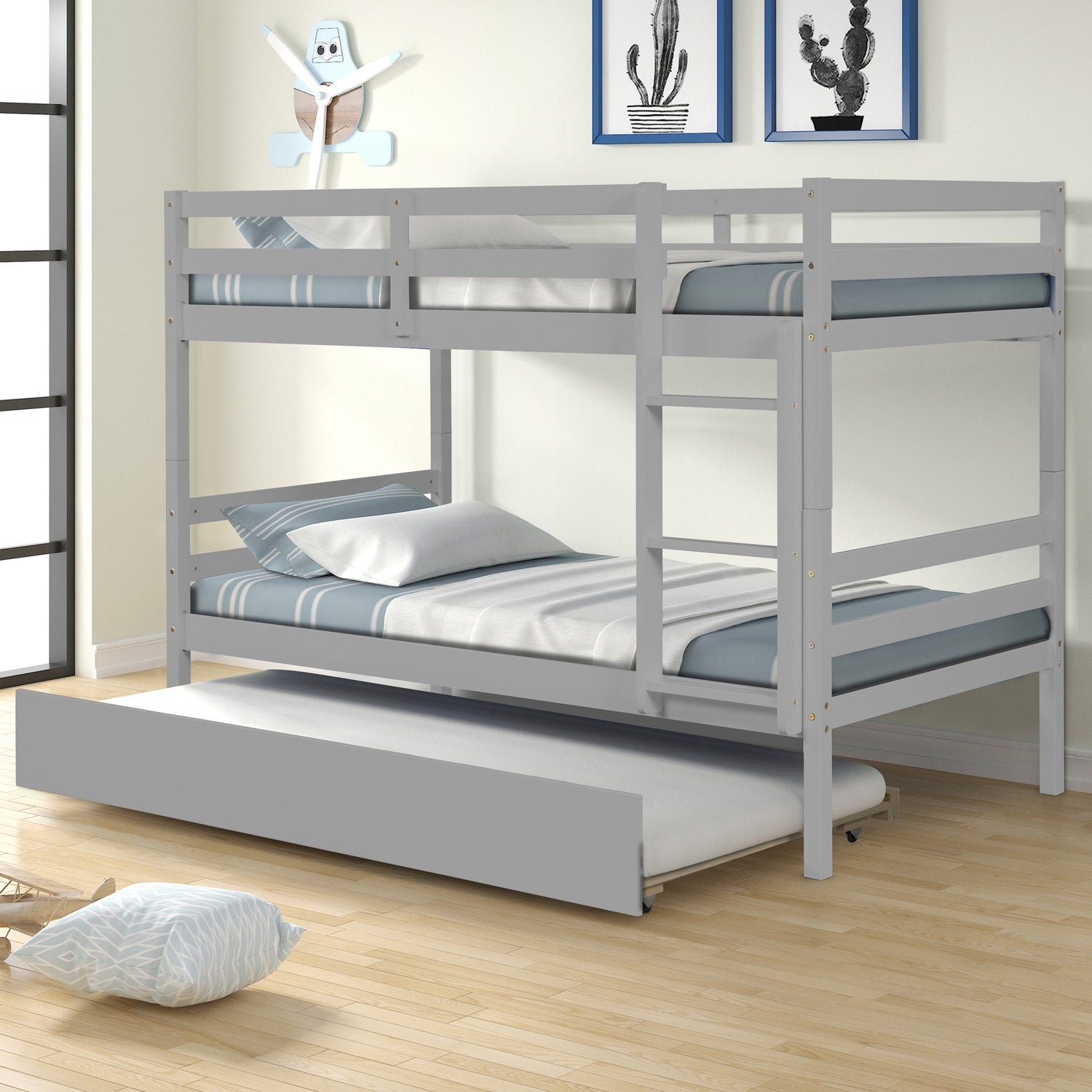 Twin over Twin Bunk Bed with Trundle, Triple Bunk Bed Frame Twin Size with Safety Rail, Can Converted into 2 Beds, Gray