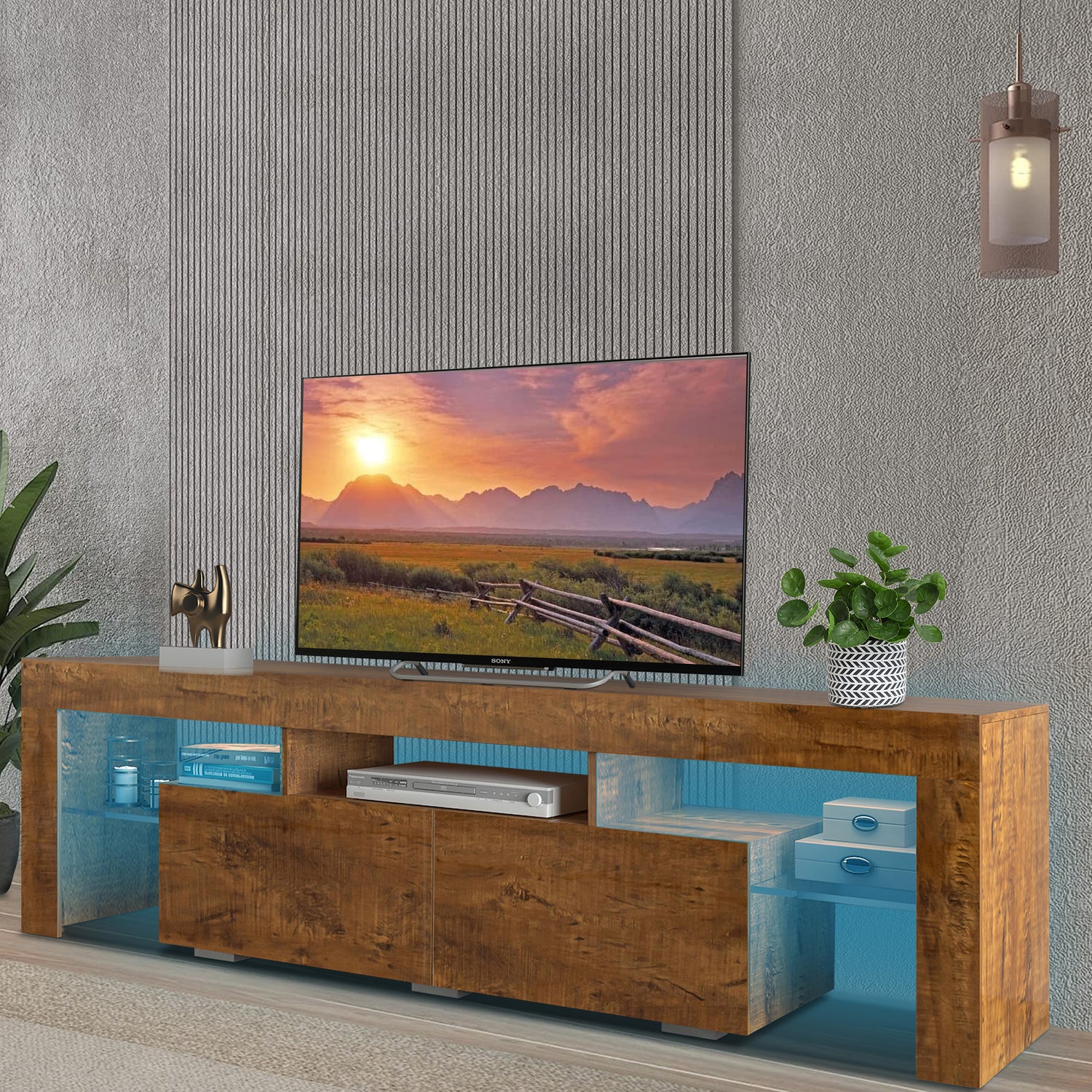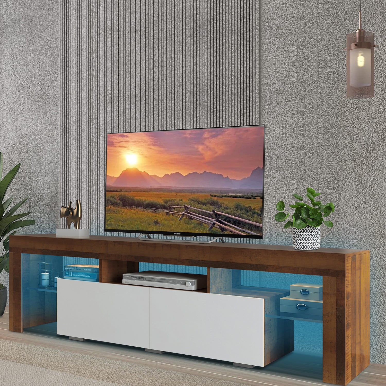 The TV cabinet is made of Solid quality MDF, the surface is smooth and easy to clean, and brings a fashionable feeling. The 16-color remote-controlled LED lights with modern characteristics will bring a warm feeling to your home.