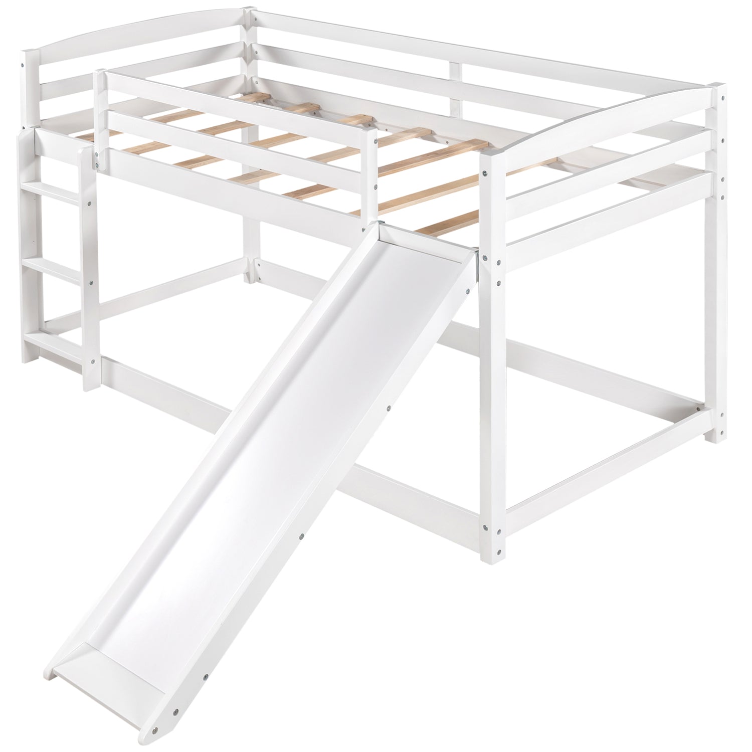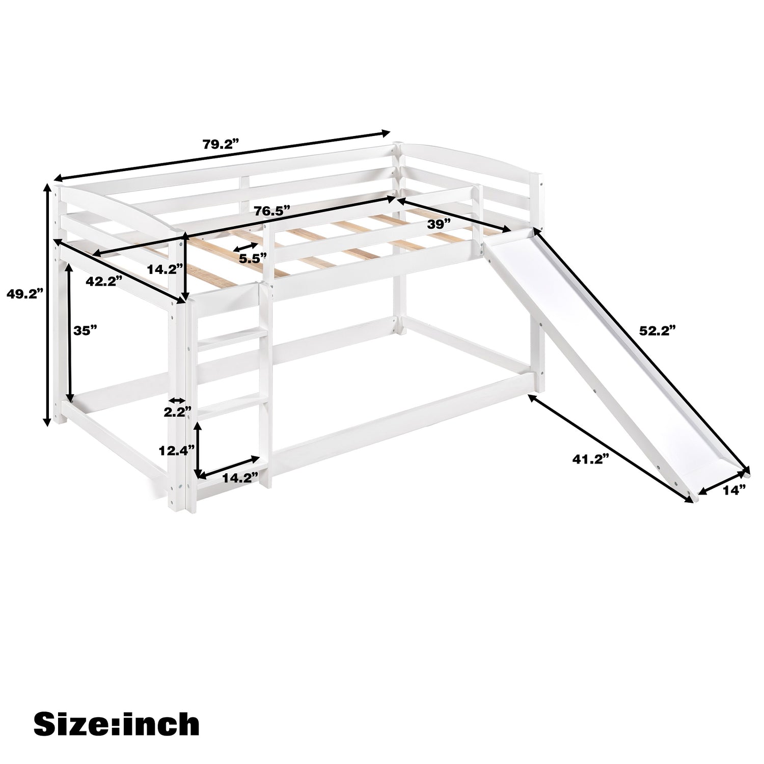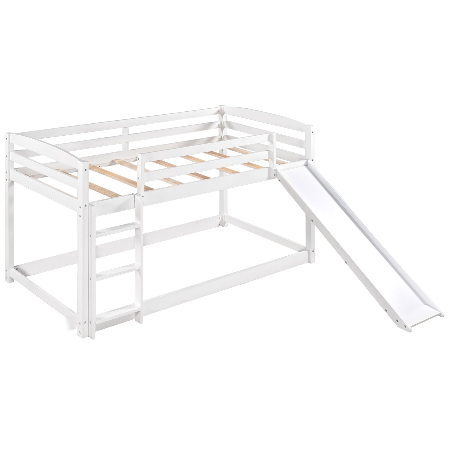 White Twin Bunk Beds with Slide for Kids, Low Profile Bunk Beds with Built-in Ladder, Kids Bedroom Furniture Floor Bed Frame for Toddlers Boys Girls, No Box Spring Needed, Hold 400LBS